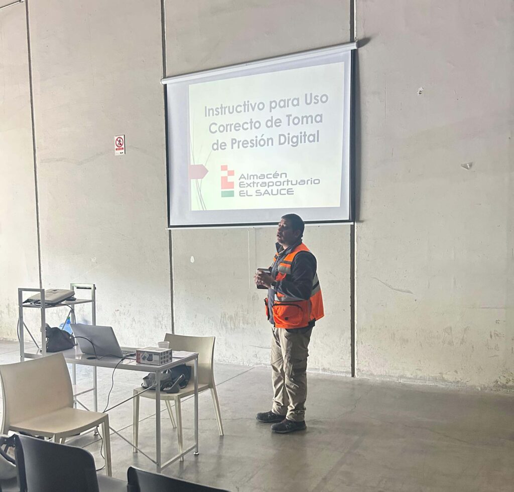 Adicionalmente, se llevó a cabo la capacitación en uso de toma de presión arterial, dirigida especialmente al personal de Operaciones (recepción, garita, despacho y administración operacional). En ella se abordaron aspectos como la correcta utilización de los equipos, la ubicación de los puntos de control dentro de la empresa, así como los rangos de presión normales y de riesgo. Este tipo de formación no solo entrega herramientas básicas de salud preventiva, sino que también permite contar con personal preparado para identificar posibles emergencias médicas y brindar apoyo inmediato, reforzando así el cuidado integral de los trabajadores.